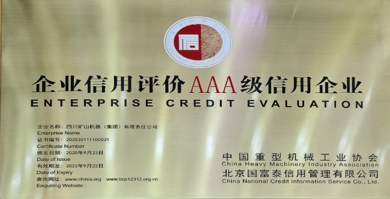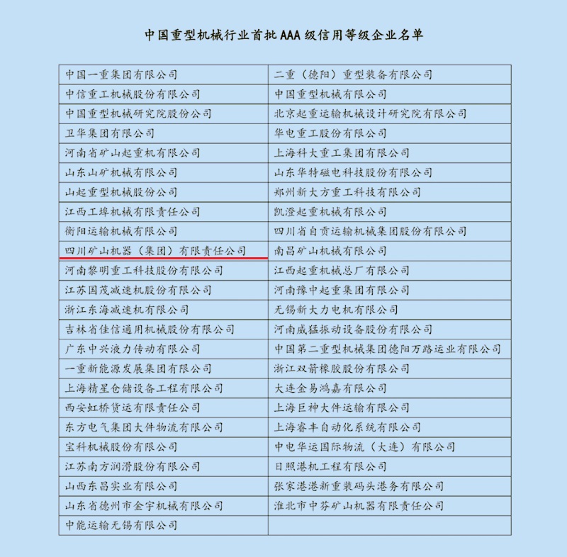 為深入貫徹落實國務(wù)院《社會信用體系建設(shè)規(guī)劃綱要(2014-2020)》,著力推動中國重型機械行業(yè)信用體系建設(shè),規(guī)范行業(yè)市場秩序,增強企業(yè)信用意識,促進行業(yè)持續(xù)和諧健康發(fā)展,由中國重型機械工業(yè)協(xié)會開展的首批中國重型機械行業(yè)企業(yè)信用等級評價工作,經(jīng)行業(yè)專家評審會嚴(yán)格評審于日前揭曉,包括川礦集團在內(nèi)的共計49家企業(yè)榮膺“中國重型機械行業(yè)首批AAA級信用等級企業(yè)”,近日將進行隆重的授牌儀式。